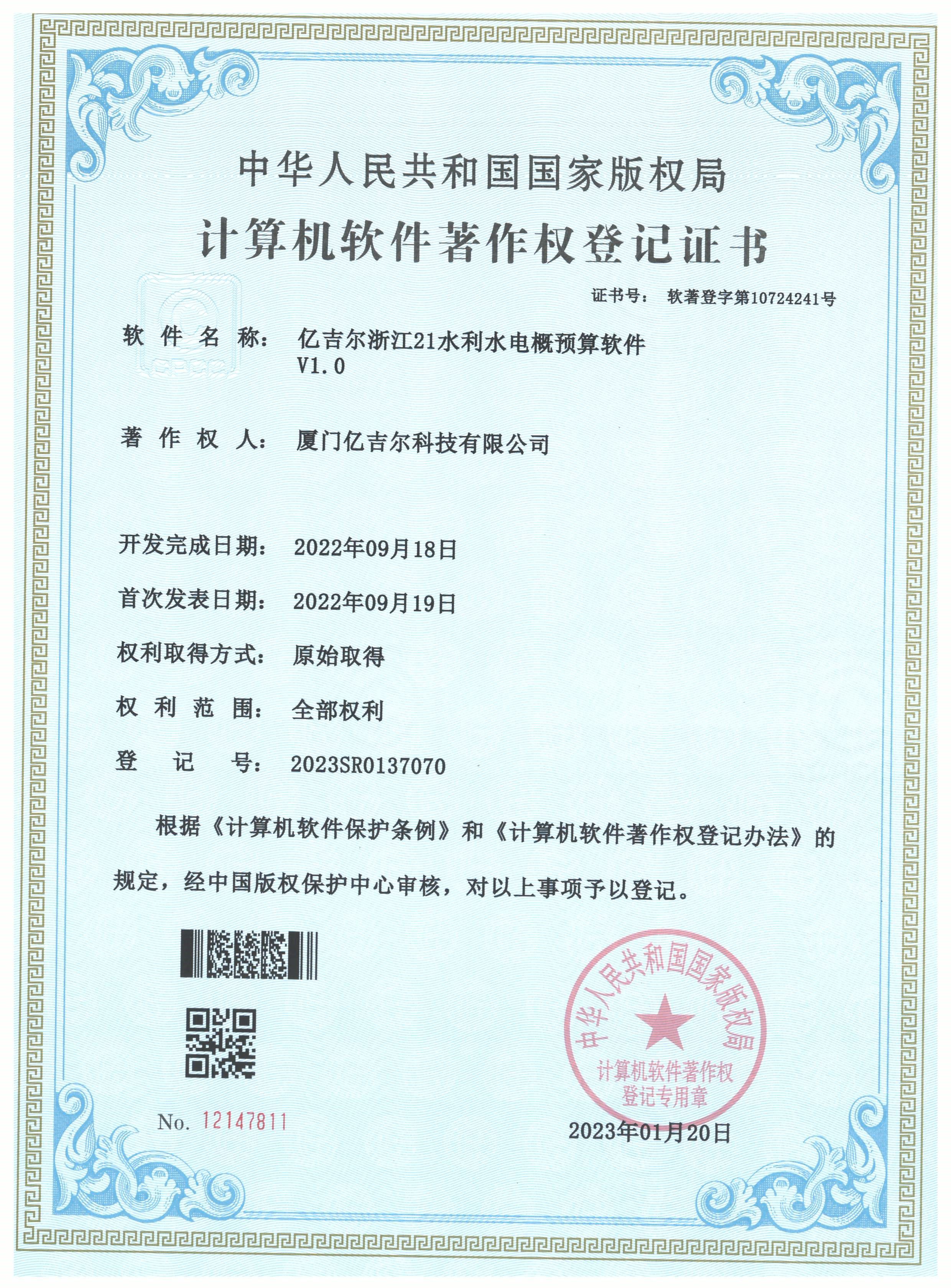億吉爾浙江21水利水電概算軟件登記證書 發(fā)布日期:2023年11月22日 瀏覽次數(shù):2278 關(guān)鍵字: 公司 1/1億吉爾浙江21水利水電概算軟件登記證書(2022R11L1869444)